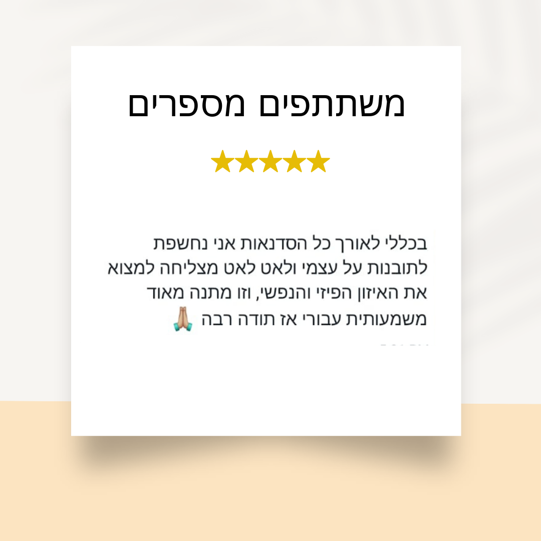 התרגול מותאם למשתתפים בהתחשב בניסיונם, מצבם הגופני והרגשי וצרכיהם האישיים – ומותנה במילוי הצהרת בריאות.